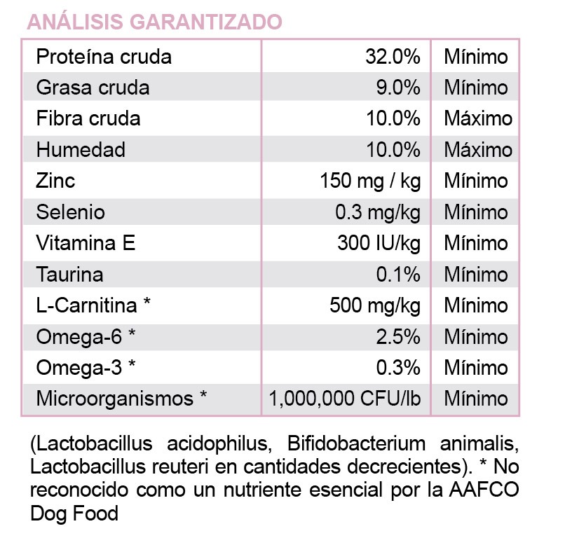 Carne De Pollo, Harina De Pollo, Harina De Pavo, Garbanzos, Lentejas, Chicharos, Celulosa En Polvo, Grasa De Pollo (Preservada Con Tocoferoles Mixtos), Sabor Natural A Pollo, Subproductos De Huevo De Gallina, Linaza, Bisulfato De Sodio, DL-Metionina, Cloruro De Colina, Taurina, Raíz De Achicoria Desecada, L-Carnitina, Producto De La Fermentación De Lactobacillus Acidophilus Desecado, Producto De La Fermentación De Bifidobacterium Animalis Desecado, Suplemento De Vitamina E, Proteinato De Zinc, Niacina, Proteinato De Manganeso, Proteinato De Cobre, Sulfato De Zinc, Sulfato De Manganeso, Sulfato De Cobre, Mononitrato De Tiamina (Vitamina B1), Suplemento De Vitamina A, Biotina, Potasio Iodado, Pantotenato De Calcio, RiboGavina (Vitamina B2), Clorhidrato De Piridoxina (Vitamina B6), Suplemento De Vitamina B12, Óxido De Manganeso, Selenito De Sodio, Suplemento De Vitamina D3 Y Ácido Fólico.
