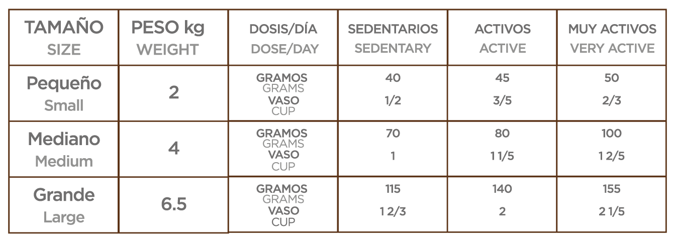 Harina de carne de pollo, arroz cervecero, gluten de maíz, grasa de pollo, maíz, harina de salmón, pulpa de remolacha, aceite de pescado, sabor natural de pollo, huevo entero deshidratado fructooligosacáridos, cloruro de potasio, cloruro de sodio, cloruro de colina, taurina, hexametafosfato de sodio, L-carnitina, glucosamina, sulfato de condroitina, B-glucanos y mananooligosacáridos (derivado de la pared celular de Saccharomyces cerevisiae activa 1x1010UFC/g), acetato de retinol (fuente de vitamina A) , colecalciferol (fuente de vitamina D), acetato de DL-α-tocoferol (fuente de vitamina E), menadiona nicotinamida bisulfato (fuente de vitamina K), ácido ascórbico (fuente de vitamina C), mononitrato de tiamina (fuente de vitamina B1), riboflavina (fuente de vitamina B2), ácido nicotínico (fuente de vitamina B3), clorhidrato de piridoxina (fuente de vitamina B6), cianocobalamina (fuente de vitamina B12), D-biotina (fuente de vitamina H), D-pantotenato de calcio (fuente de vitamina B5), ácido fólico, oligoelementos (proteinato de zinc, proteinato de manganeso, proteinato de cobre, EDDI, glicinato de hierro, selenito de sodio), extracto de Yucca schidigera, mezcla de tocoferoles y extracto de romero como conservadores.