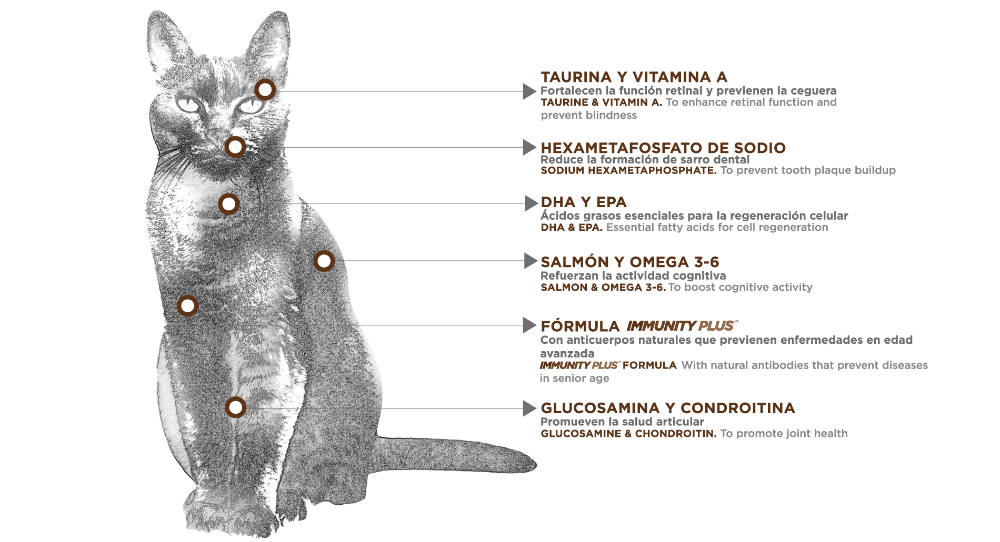 Descripción: Croquetas especiales para gatos adultos mayores. Protegen las articulaciones, refuerzan el sistema inmune y mantienen una buena digestión en la etapa senior. INGREDIENTES